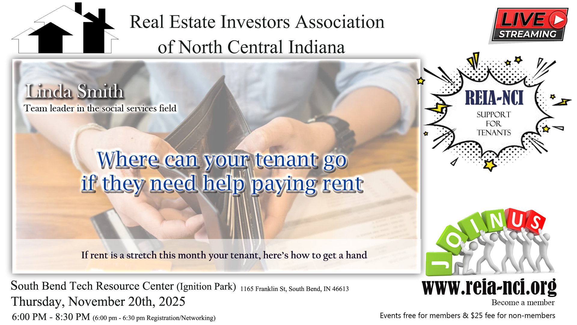 www.REIA-NCI.org  (Real Estate Investors Association of North Central Indiana) does not give legal, tax, economic, or investment advice. REIA-NCI disclaims all liability for the action or inaction taken or not taken as a result of communications from or to its members, officers, directors, employees and contractors. Each person should consult their own counsel, accountant and other advisors as to legal, tax, economic, investment, and related matters concerning Real Estate and other investments.